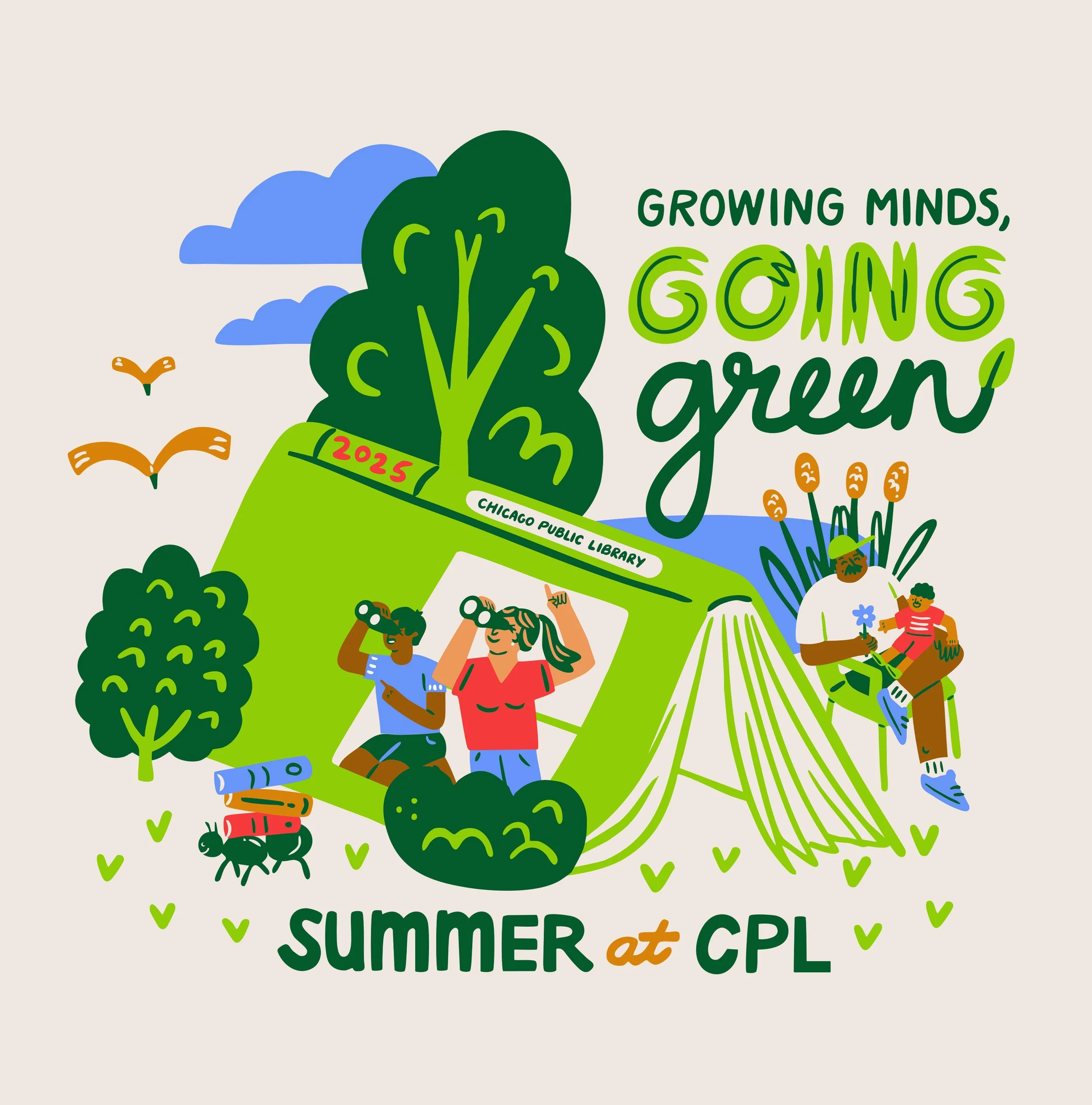As the 2025 selected artist, I created a wide variety of print and digital assets for Chicago Public Library’s annual Summer at CPL reading initiative. Using the theme as “going green”, I created the main summer artwork along with spot illustrations, a maze, badges, coloring pages, a self portrait and much more.